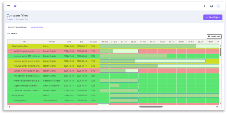 The Project Gantt Chart is automatically generated based on the initial data entered and dynamically updates as action owners progress with their tasks. It uses color codes to highlight project abnormalities, providing a clear visual overview of project status.