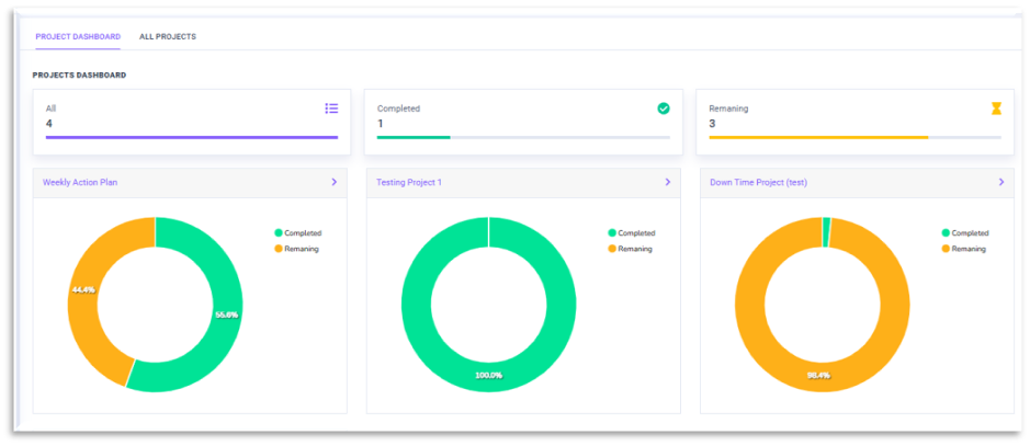 The Project Gantt Chart is automatically generated based on the initial data entered and dynamically updates as action owners progress with their tasks. It uses color codes to highlight project abnormalities, providing a clear visual overview of project status.